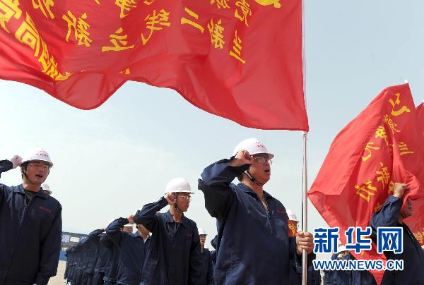6月26日,參加創(chuàng)先爭(zhēng)優(yōu)的中國(guó)中鐵四局黨員代表進(jìn)行創(chuàng)先爭(zhēng)優(yōu)宣誓。新華社記者王雷攝