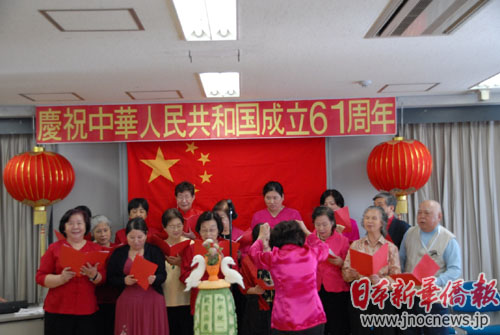 東京各界華僑和應(yīng)邀前來參加活動的日中友好會館、在日朝鮮人總聯(lián)合會、在日大韓民國民團(tuán)、日本新華僑華人會、在日中國企業(yè)協(xié)會、日本中華總商會、橫浜華僑總會、長野華僑總會等團(tuán)體在中華人民共和國61年國慶前夕齊聚一堂,華人華僑的愛國思鄉(xiāng)之情涌上心頭。席間,東京華僑婦女會會長吳少煖帶領(lǐng)婦女會員們?yōu)榇髸I(xiàn)唱一曲《五星紅旗》,不僅抒發(fā)了大家思念之情,更激發(fā)了眾人的愛國激情。吳少煖包含激情地表示:“我們獨(dú)在異鄉(xiāng)為異客,每逢佳節(jié)倍思親。雖然身在異鄉(xiāng),但是思念祖國的心是一直沒有改變過的。望祖國今后更加繁榮富強(qiáng)。”