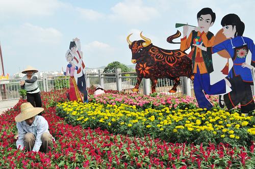 9月28日,園林工人在南寧市蒲廟大橋橋頭擺放迎國慶花壇。國慶臨近,廣西南寧市街頭和廣場(chǎng)擺放的迎國慶花壇亮相。據(jù)悉,南寧用100余萬盆鮮花配以各類藝術(shù)造型,在城市街頭和廣場(chǎng)擺放一批充滿壯鄉(xiāng)濃郁民族風(fēng)情的花壇,為節(jié)日增添了喜慶祥和的氣氛。新華社發(fā)(陸波岸 攝)