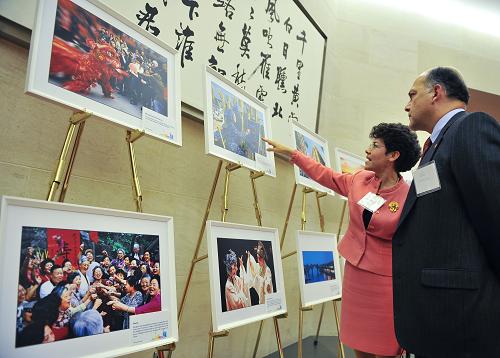 9月28日,在美國(guó)首都華盛頓,來(lái)賓在國(guó)慶招待會(huì)上觀看圖片展覽。 當(dāng)天,中國(guó)駐美國(guó)大使館舉行國(guó)慶招待會(huì),慶祝中華人民共和國(guó)成立61周年,美國(guó)政府官員、駐美外國(guó)使節(jié)和各界友好人士等數(shù)百人出席。新華社記者 張軍 攝