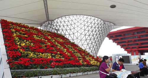 9月29日,游客在世博軸上一處“國慶”字樣的花壇旁小憩。新華社記者 裴鑫 攝