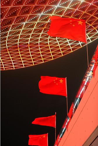 9月28日晚,世博軸陽光谷旁的國旗迎風招展。新華社記者 徐昱 攝