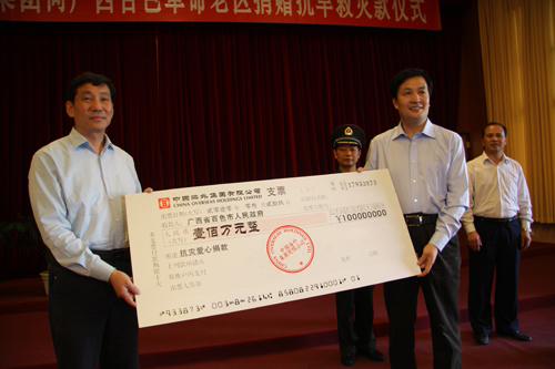人民網(wǎng)百色3月31日電 (記者龐革平、謝建偉)3月31日下午,香港中國(guó)海外集團(tuán)有限公司和廣西百色豐林人造板有限公司分別向廣西百色災(zāi)區(qū)捐款100萬(wàn)元。此前,上海浦東發(fā)展銀行股份有限公司已向百色市捐款50萬(wàn)元,百色軍分區(qū)及所屬部隊(duì)官兵則為百色市捐款10.29萬(wàn)元。