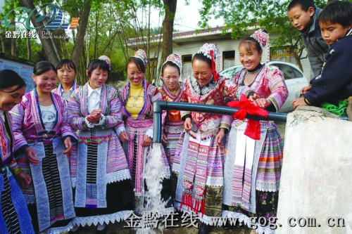 4月23日,貴陽市第一個抗旱應(yīng)急水利工程——清鎮(zhèn)市流長苗族鄉(xiāng)磅寨應(yīng)急供水工程在該鄉(xiāng)腰巖村通水,日供水1993立方米,解決了15個行政村2萬人飲水難。圖為苗族同胞開閘放水。