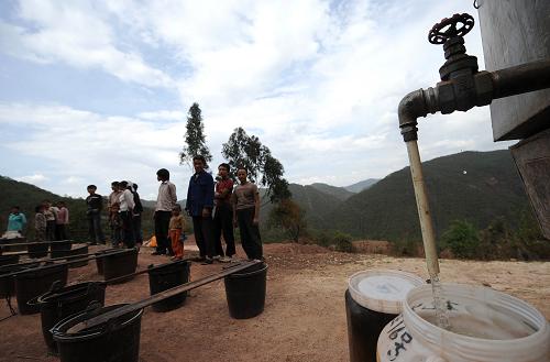 4月21日,云南省楚雄市東華鎮(zhèn)達(dá)苴村的彝族群眾在送水車(chē)前排隊(duì)取水。新華社記者 藺以光 攝