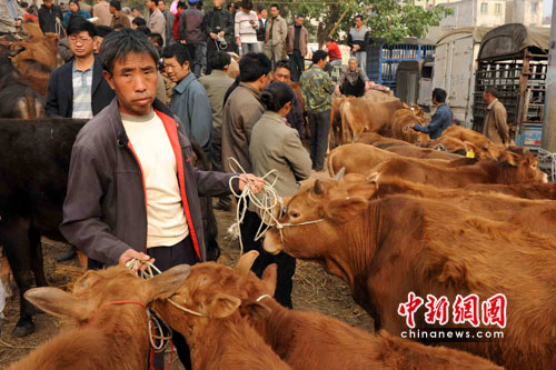 秦大章夫婦看上了馮元達一頭不到兩歲的小牛,“沒換牙齒、蹄也不錯!鼻卮笳潞軆(nèi)行的告訴記者。在此后近30分鐘的時間里,一場在2300元至1900元人民幣之間的價錢拉鋸戰(zhàn)進行起來。最終,在周邊人的撮合下,秦大章以2010元的價錢買到了他看上的小牛。