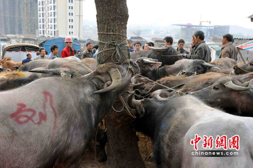 近中午時間,市場里買賣的人群還未散去。秦大章夫婦牽著剛買的;丶伊,這得花上2、3個小時的時間;氐郊遥古5乃质且粋問題,“沒干凈水夠它喝,只能像鄰居那樣把洗菜、洗臉腳的水留下給牛喝!鼻卮笳碌钠拮诱f。雖然羨慕村里有人可以用機器耕地,但家里的4、5畝地多在石頭叢生的半山腰上,秦家夫婦還是只能選擇最傳統(tǒng)的牛耕方式。