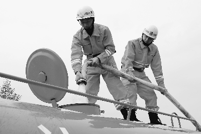 4月1日,貴州省黔西南州興仁縣消防大隊(duì)兩名消防士兵緊緊握住水管給抗旱救災(zāi)車灌水。