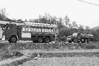 4月1日,貴州省黔西南州興仁縣消防大隊(duì)用消防車給魯?shù)A營回族鄉(xiāng)抗旱救災(zāi)拉水車送水。