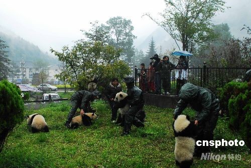 5月12日四川發(fā)生大地震后,臥龍保護(hù)區(qū)管理局的職工于第一時(shí)間將大熊貓轉(zhuǎn)移到安全地帶。在此次地震中,臥龍保護(hù)區(qū)管理局的房舍嚴(yán)重受損,其中32套大熊貓圈舍中有14套全部損毀,其余嚴(yán)重受損。圖為熊貓幼仔轉(zhuǎn)移至沙灣。 中新社發(fā) 臥龍人 攝