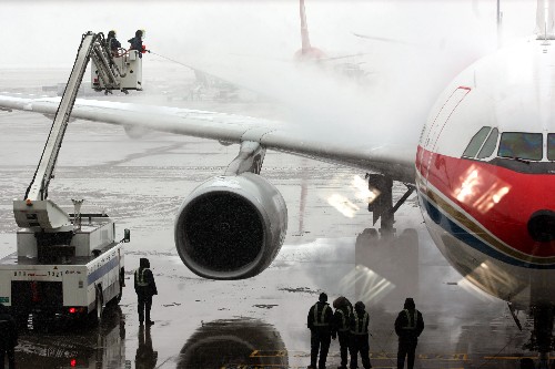 2月2日,機(jī)場出動(dòng)除冰車為飛機(jī)噴灑除冰劑。新華社記者 劉穎 攝