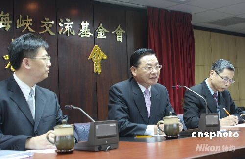 海協(xié)會(huì)與;鶗(huì)即將恢復(fù)協(xié)商會(huì)談。六月十日中午,海峽交流基金會(huì)董事長(zhǎng)江丙坤(中)、副董事長(zhǎng)兼秘書長(zhǎng)高孔廉(右一),在海基會(huì)十七樓第一會(huì)議室舉行赴北京商談前的特別記者會(huì)。六月十一日,江丙坤將率代表團(tuán)赴北京。 江丙坤說:“明天,我們開始進(jìn)行的是一項(xiàng)舉世矚目的活動(dòng),大家都在寫歷史! 中新社發(fā) 耿軍 攝