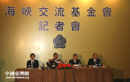 中國(guó)臺(tái)灣網(wǎng)6月13日北京消息 臺(tái)灣海基會(huì)代表團(tuán)目前正在下榻的北京洲際飯店召開記者會(huì),;鶗(huì)董事長(zhǎng)江丙坤、副董事長(zhǎng)兼秘書長(zhǎng)高孔廉等四人出席記者會(huì)。此前,在今天上午日9時(shí)許,海協(xié)會(huì)會(huì)長(zhǎng)陳云林和海基會(huì)董事長(zhǎng)江丙坤在大陸居民赴臺(tái)旅游協(xié)議及兩岸周末包機(jī)會(huì)談紀(jì)要上簽字。 (李艷波)