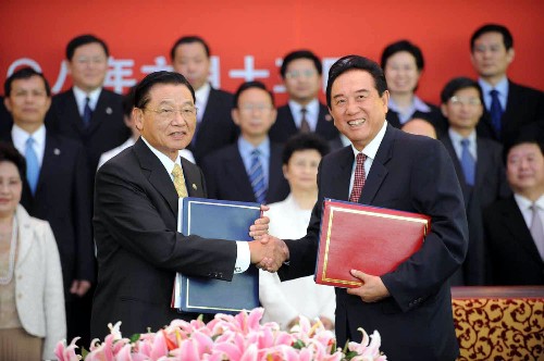 資料圖片:6月13日9時許,海協(xié)會與;鶗诒本┚蛢砂吨苣┌鼨C與大陸居民赴臺旅游簽署協(xié)議。這是海協(xié)會會長陳云林和;鶗麻L江丙坤在簽字儀式上握手。 新華社記者李曉果攝