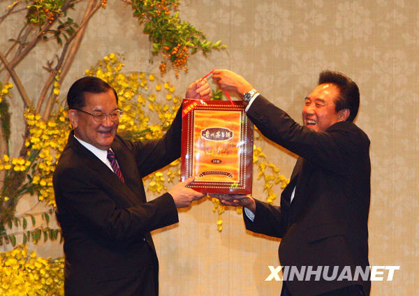 11月4日,連戰(zhàn)向陳云林贈(zèng)送禮物。當(dāng)日,中國(guó)國(guó)民黨榮譽(yù)主席連戰(zhàn)在臺(tái)北宴請(qǐng)海協(xié)會(huì)會(huì)長(zhǎng)陳云林一行。 新華社記者 邢廣利 攝