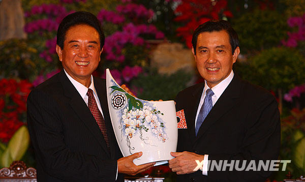 11月6日,馬英九在臺北賓館會見海協(xié)會會長陳云林一行。這是陳云林向馬英九贈送禮品。新華社記者 邢廣利 攝