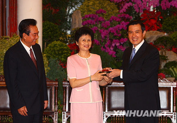 11月6日,馬英九在臺北賓館會見海協(xié)會會長陳云林一行。這是馬英九向陳云林夫人賴曉華贈送禮品。新華社記者 邢廣利 攝