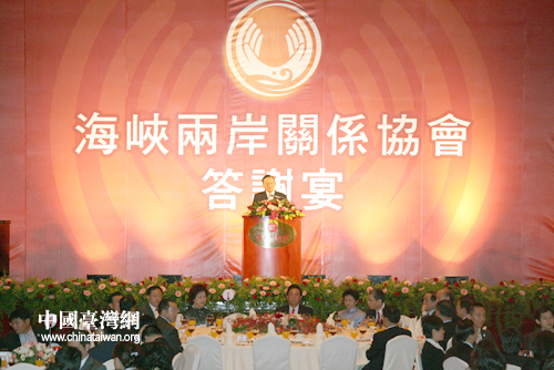中國臺灣網(wǎng)11月6日臺北消息 海峽兩岸關(guān)系協(xié)會6日晚在臺北市圓山飯店舉行答謝晚宴,宴請;鶗麻L江丙坤及;鶗嘘P(guān)人士,并慶祝兩會成功簽署四項協(xié)議。