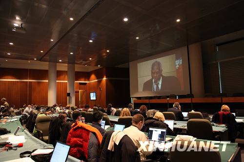 這是1月25日在加拿大蒙特利爾拍攝的海地震后重建部長(zhǎng)級(jí)會(huì)議新聞中心(圖中投影儀上顯示海地總理貝勒里夫正在會(huì)議上發(fā)言)。海地震后重建部長(zhǎng)級(jí)會(huì)議當(dāng)日在此召開。新華社記者張大成攝