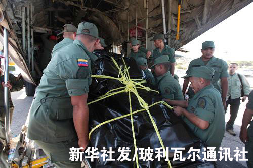 1月15日,在委內(nèi)瑞拉邁克蒂亞的國際機場,委內(nèi)瑞拉軍人將救災(zāi)物資搬運上飛機。當日,委內(nèi)瑞拉支援海地地震災(zāi)區(qū)的第二批救援人員攜帶救災(zāi)物資奔赴海地。第二批救援人員共29人,其中包括25名軍方人員、2名地震專家和2名民防專家。新華社發(fā)/玻利瓦爾通訊社