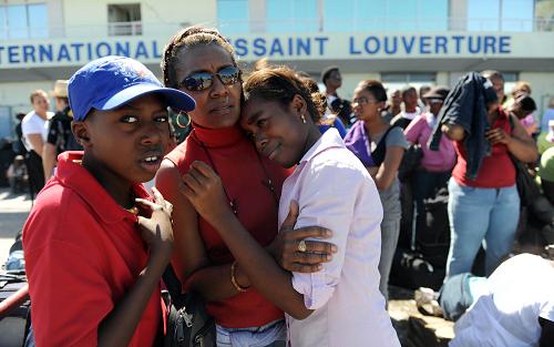 圖為1月16日,在海地首都太子港機(jī)場,當(dāng)?shù)孛癖娬诘却枭⒊冯x的飛機(jī)。新華社發(fā)