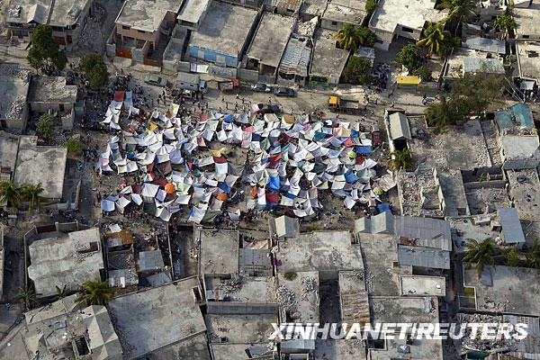 這張由聯(lián)合國提供的照片顯示,人們在海地首都太子港遭到地震損毀的建筑物中間搭起帳篷(1月12日攝)。海地當(dāng)?shù)貢r間12日下午發(fā)生強(qiáng)烈地震和多起余震,造成首都太子港大量房屋受損或倒塌,當(dāng)?shù)厝耸糠Q地震可能造成數(shù)萬人死亡。新華社/路透