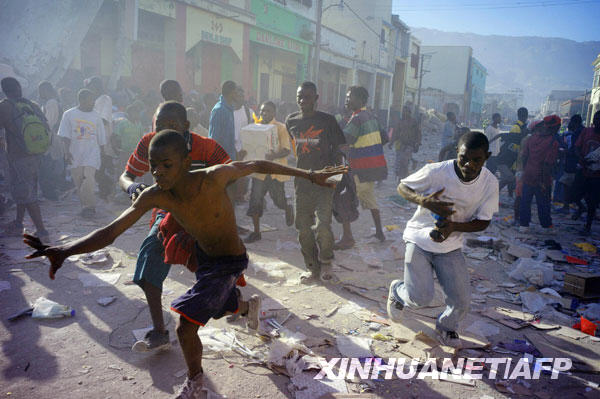1月17日,在海地首都太子港,搶劫者躲避警方追擊。海地地震發(fā)生后,因嚴重缺衣少食,許多不法分子,包括一些饑餓難耐的災民在內(nèi),肆意持槍或拿刀搶劫財物。新華社/法新