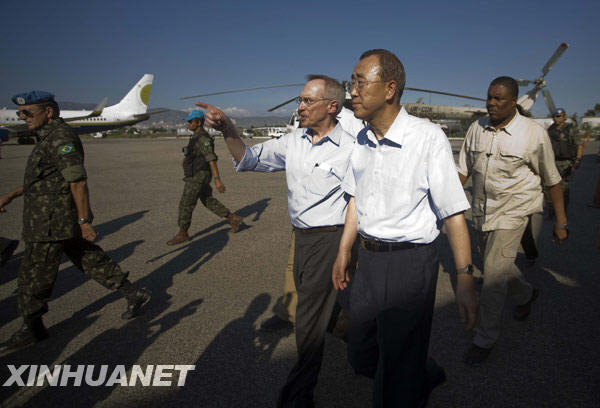 1月17日,聯(lián)合國秘書長潘基文(前)抵達(dá)海地首都太子港,開始對地震災(zāi)區(qū)視察。