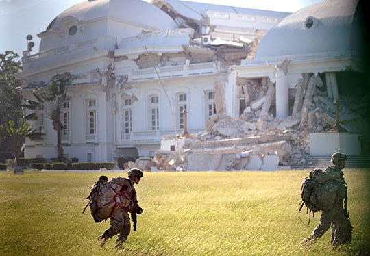 圖為美軍士兵正在徒步通過被地震嚴重損毀的海地總統(tǒng)府前的草坪。