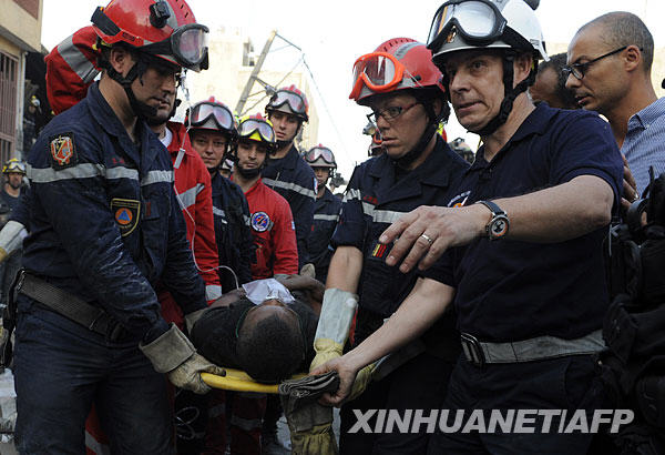 1月23日,在海地首都太子港,國際救援人員解救出威斯蒙德·厄安圖斯。海地地震11天后,救援人員在首都太子港一座酒店廢墟下成功解救出一名23歲男子。這名目前身體狀況良好的男子被救出時還說了一句“謝謝”。新華社/法新