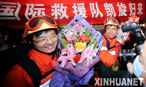 1月27日,救援隊隊員抵達首都國際機場。當日,中國國際救援隊圓滿完成海地震后搜救和醫(yī)療救治任務返回北京。 新華社記者王建華攝
