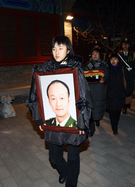 然而天妒英才,上蒼嫉妒我擁有你這樣疼愛(ài)我的好爸爸,嫉妒媽媽擁有你這樣的好丈夫,嫉妒奶奶擁有你這樣的好兒子!你可曾記得出征前,你說(shuō)過(guò)如果有傷亡,那第一個(gè)一定是你!我曾怨你,說(shuō)這樣不吉利的話,我曾怨你這樣不顧我和媽媽……但我也知道現(xiàn)在的你無(wú)怨無(wú)悔,你一生轟轟烈烈,雖然你沒(méi)有盡孝,但你是中國(guó)人民的好兒子,盡管你還沒(méi)看到丫頭長(zhǎng)大成人,你還沒(méi)有和媽媽白頭偕老,你還沒(méi)有讓奶奶爺爺換上新房.但是現(xiàn)在,爸爸,我們所有人,不怪你,不怨你,因?yàn)槟闶菫榫S護(hù)世界和平而犧牲的,你的死,重于泰山。你是我們?nèi)业尿湴,是我們的榜樣,是我們前進(jìn)的動(dòng)力!