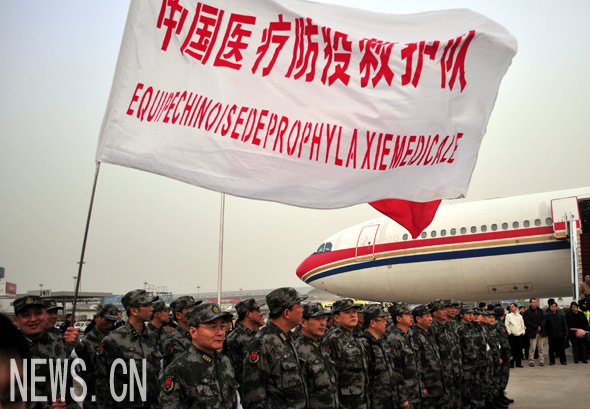 這支由40人組成的醫(yī)療防疫救護(hù)隊(duì),是中國(guó)政府根據(jù)聯(lián)合國(guó)人道主義援助協(xié)調(diào)辦公室的要求,從解放軍總部機(jī)關(guān)、南京軍區(qū)總醫(yī)院、軍事醫(yī)學(xué)科學(xué)院、解放軍第二軍醫(yī)大學(xué)和第302醫(yī)院等單位抽選組成,其中絕大部分是中青年技術(shù)骨干,90%掌握一門外語,70%參加過國(guó)際維和任務(wù),并有參加四川汶川特大地震救援的經(jīng)驗(yàn)。醫(yī)療防疫救護(hù)隊(duì)攜帶了手術(shù)、急救、診療、檢查、消毒和生活保障等裝備和必要藥品。他們到達(dá)災(zāi)區(qū)后,將開展現(xiàn)場(chǎng)應(yīng)急醫(yī)學(xué)救援、醫(yī)療巡診、衛(wèi)生防疫等工作,并視情協(xié)助當(dāng)?shù)蒯t(yī)療機(jī)構(gòu)開展醫(yī)療救治、恢復(fù)醫(yī)療機(jī)構(gòu)功能。