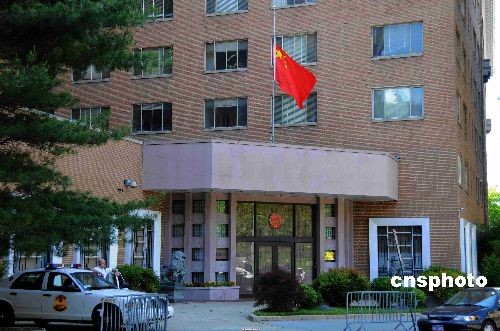 資料圖片:中國駐美大使館老館——坐落美國華盛頓特區(qū)西北區(qū)的“溫莎公園”旅館。圖為去年五月十九日,中國為四川地震死難者進行全國哀悼的第一天,駐美大使館降半旗悼念死難同胞。 中新社發(fā) 邱江波 攝