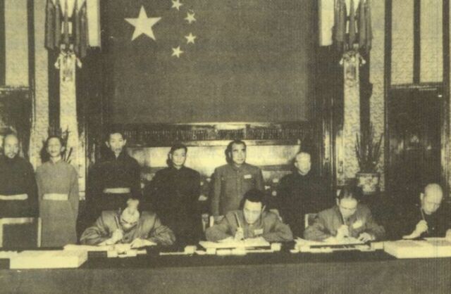 中央人民政府全權(quán)代表和西藏地方政府全權(quán)代表經(jīng)過談判之后,對(duì)和平解放西藏取得了一致的意見。一九五一年五月二十三日,《中央人民政府與西藏地方政府關(guān)于和平解放西藏辦法的協(xié)議》在北京正式簽訂。簽字儀式由中央人民政府副主席朱德、李濟(jì)深,中央人民政府政務(wù)院副總理陳云主持。