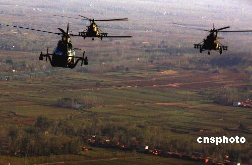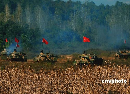 2008年10月24日,中國人民解放軍濟(jì)南軍區(qū)參加“前鋒--2008”演習(xí)部隊(duì)在訓(xùn)練基地集結(jié)完畢,裝甲、陸航部隊(duì)進(jìn)入訓(xùn)練階段。這次演習(xí)以信息化條件聯(lián)合作戰(zhàn)為背景,進(jìn)行實(shí)兵、實(shí)彈演練,將有二百余名外國軍人、留學(xué)生參觀。據(jù)悉,這是中國軍隊(duì)首次大規(guī)模對外國留學(xué)生開放軍事訓(xùn)練演習(xí)。 中新社發(fā) 宋吉河 攝