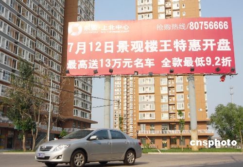 2008年7月15日,北京北五環(huán)一家樓盤打出“最高送13萬名車全款最低9.2折”廣告吸引購房人。此后,北京樓市再現(xiàn)“買房打折送車”現(xiàn)象。 中新社發(fā) 吳芒子 攝