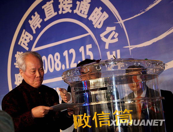2008年12月15日,出生在臺(tái)灣的鄭堅(jiān)老先生在北京舉行的兩岸直接通郵儀式上投寄出寄往臺(tái)灣的家書。當(dāng)日,眾望所歸的兩岸海運(yùn)直航、空運(yùn)直航以及直接通郵正式啟動(dòng),兩岸同胞魂?duì)繅?mèng)縈的直接“三通”得以基本實(shí)現(xiàn)。新華社發(fā)