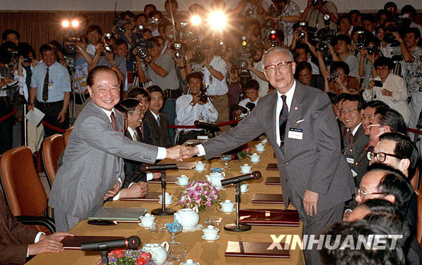 1993年4月,海峽兩岸兩個(gè)民間團(tuán)體的領(lǐng)導(dǎo)人汪道涵和辜振甫在新加坡會(huì)晤。這是1993年4月27日,海峽兩岸關(guān)系協(xié)會(huì)會(huì)長(zhǎng)汪道涵(左)與海峽兩岸交流基金會(huì)董事長(zhǎng)辜振甫首次會(huì)談前握手。新華社發(fā)