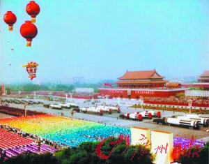 我覺得自己很是神氣,因為我站在第一排,手里的花環(huán)是亮麗的紅色。整整一個暑假,我們在學(xué)校的操場、在機場的停機坪上、甚至在天安門廣場演練,走正步喊口號,有節(jié)奏地揮舞花環(huán)。
