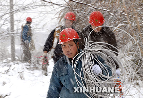 1月28日,宣城供電公司水東供電所員工冒著大雪搶修線路。 新華社發(fā)(李曉紅攝)