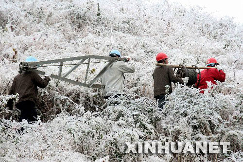 1月22日,凱里市供電部門職工趕往事故現(xiàn)場(chǎng)搶修供電設(shè)施。受大面積冰凍災(zāi)害天氣影響,貴州電網(wǎng)多處線路受損,黔東南苗族侗族自治州和銅仁地區(qū)有9個(gè)縣停止供電。凱里電網(wǎng)2000多名職工投入“抗冰保電”一線晝夜搶修。 新華社發(fā)(吳如雄 攝)