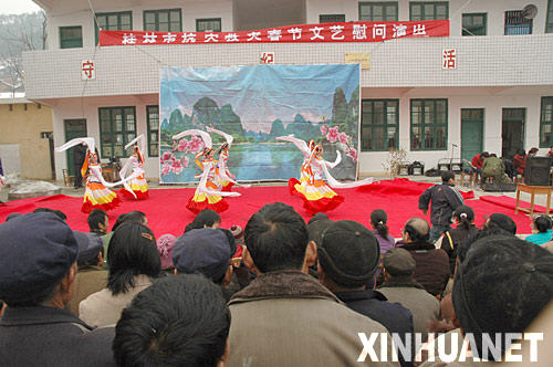 當日,桂林市彩調劇團來到桂林受冰雪災害影響最嚴重的灌陽縣龍橋村,為災區(qū)群眾獻上一臺精彩的文藝演出,受到群眾的歡迎。 新華社發(fā)(楊紹功攝)