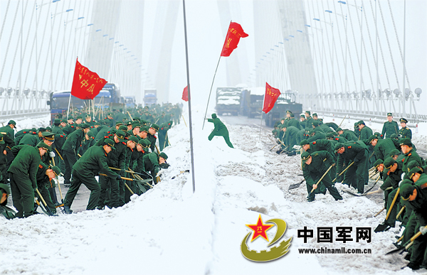 連日來,武警江蘇總隊一支隊共出動官兵四千余人次,在南京長江二橋、高速公路等交通主干道清掃積雪。圖為一月二十九日,官兵正在清除南京長江二橋上的冰雪。郎從柳攝