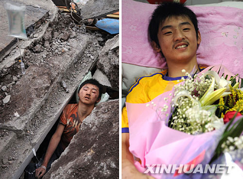 5月24日,廖波在病床上手捧鮮花(右圖)。5月13日,廖波在北川中學(xué)的廢墟里接受緊急救治(左圖 資料照片)。