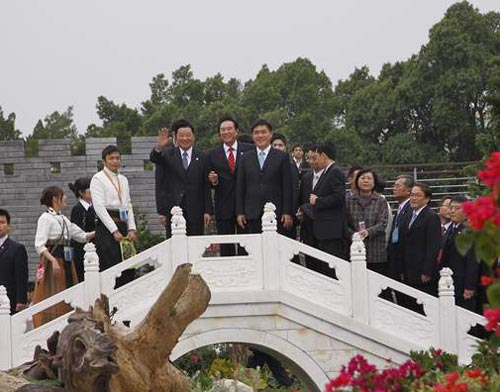 陳云林等一行人離臺前參觀臺北花博,花博9點(diǎn)開園,陳云林參觀時間特地提早一個小時,8點(diǎn)多就到花博園區(qū),陳云林先逛圓山園區(qū)爭艷館,再到大陸參展的西安庭園及上海豫園,陳云林與;鶗L江炳坤、臺北市長郝龍斌還特地在上海庭園的造橋上拍照留戀,接著參觀流行館及花博最熱門的夢想館。