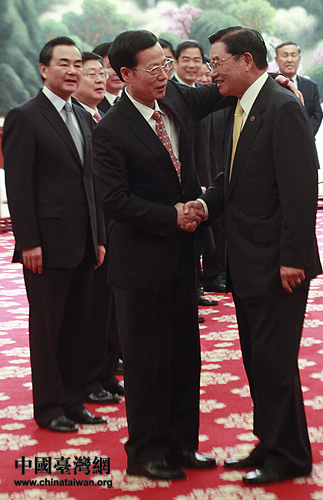 21日午間,中共中央政治局委員、中共天津市委書記張高麗在天津會(huì)見了參加第七次會(huì)談的兩岸兩會(huì)協(xié)商代表團(tuán)的主要成員,中臺(tái)辦主任王毅陪同會(huì)見,圖為張高麗與江丙坤握手致意。(中國臺(tái)灣網(wǎng) 陳佳慧 攝)