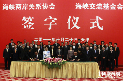 海協(xié)會(huì)會(huì)長(zhǎng)陳云林與臺(tái)灣海基會(huì)董事長(zhǎng)江丙坤20日下午2點(diǎn)30分在天津簽署了《海峽兩岸核電安全合作協(xié)議》。(中國(guó)臺(tái)灣網(wǎng) 陳佳慧 攝)