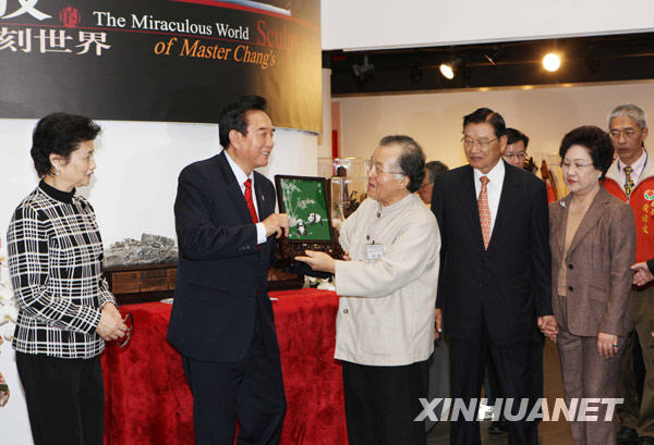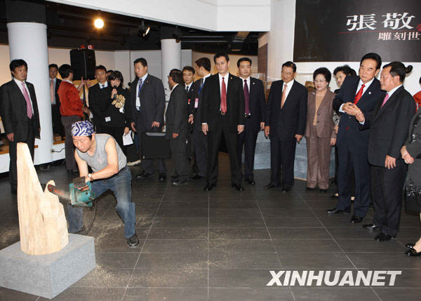 當(dāng)日,剛剛結(jié)束兩會第四次領(lǐng)導(dǎo)人會談的海協(xié)會會長陳云林在;鶗麻L江丙坤的陪同下,在苗栗縣參觀三義木雕博物館。新華社記者 袁滿 攝