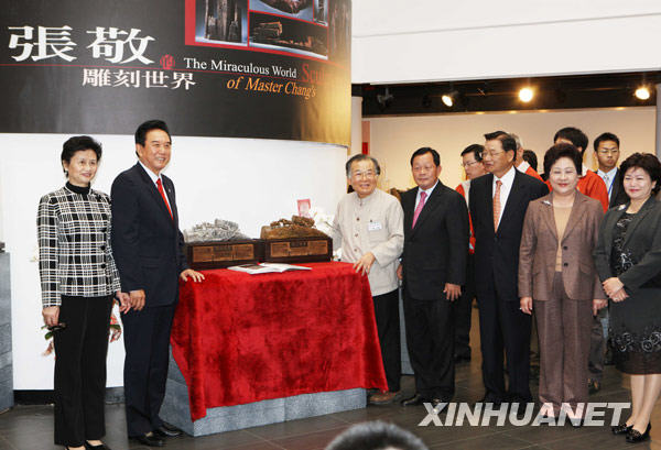 12月23日,海協(xié)會會長陳云林(左二)在參觀木雕作品后與雕刻大師張敬互換紀(jì)念品。